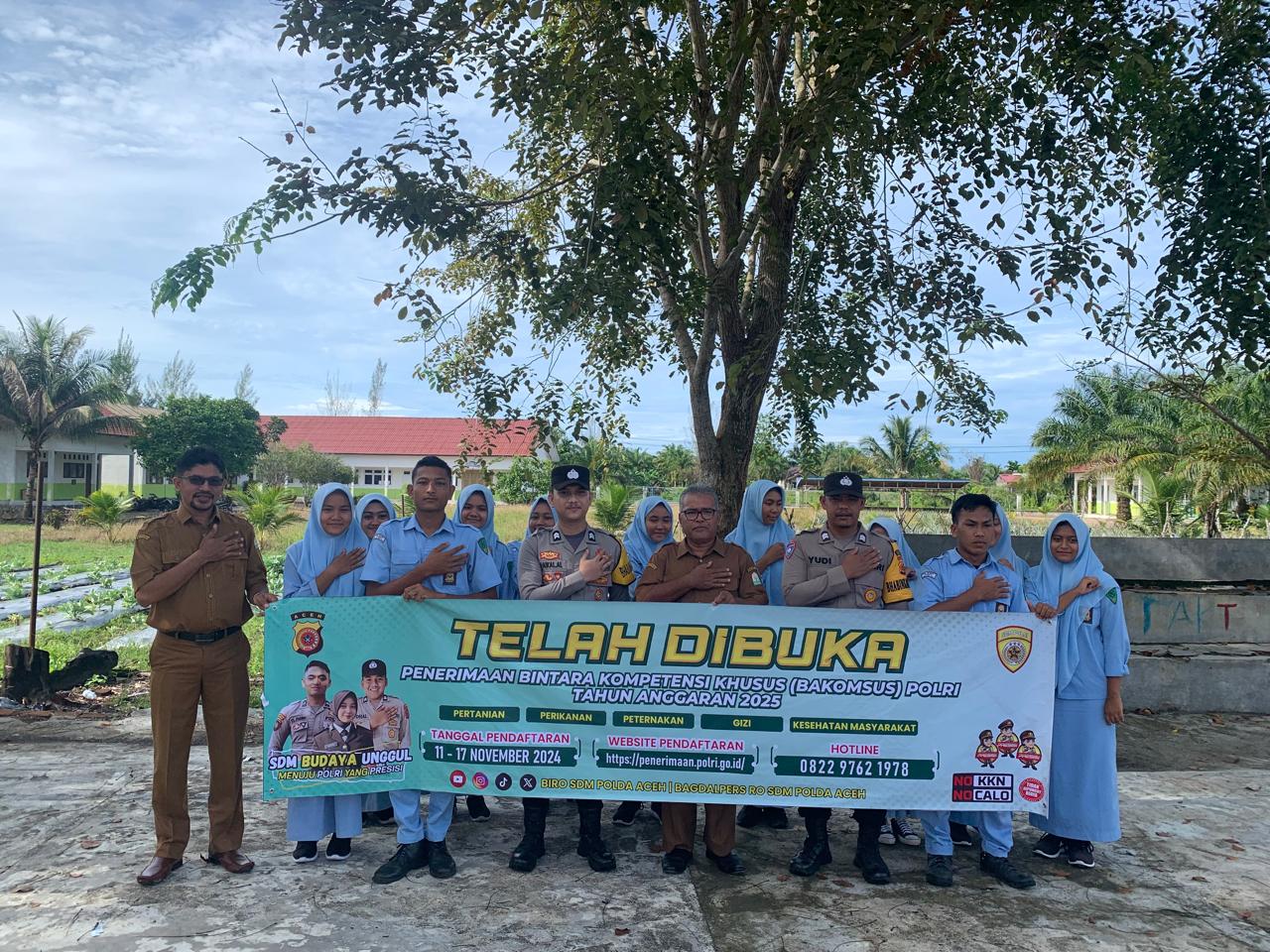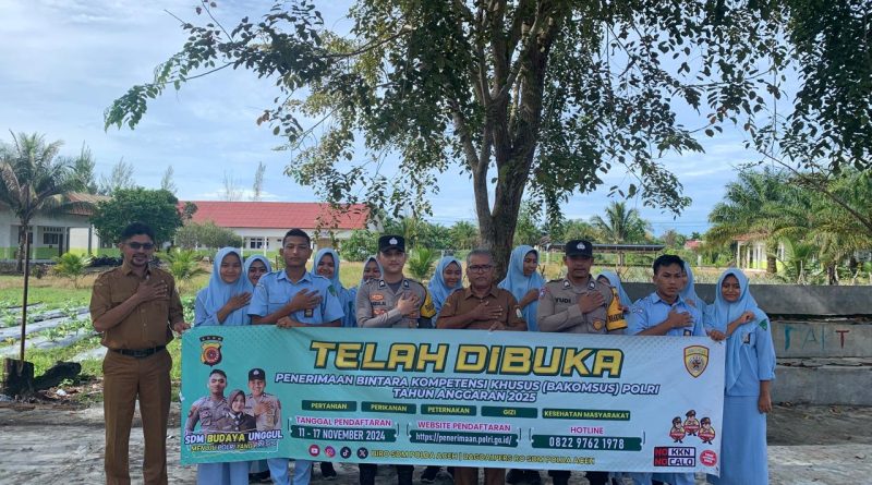 Calang – Selasa 12 November 2024. Bhabinkamtibmas Polsek Panga, Polres Aceh Jaya, melakukan sosialisasi terkait penerimaan Bintara Kompetensi Khusus (BAKOMSUS) Polri Tahun Anggaran 2025 kepada siswa-siswi SMK Negeri 1 Panga, Kecamatan Panga, Kabupaten Aceh Jaya. Sosialisasi ini bertujuan untuk memberikan pemahaman mengenai persyaratan, prosedur, serta peluang yang ada dalam rekrutmen BAKOMSUS Polri, yang dibuka untuk memberikan kesempatan kepada putra-putri terbaik bangsa bergabung dengan institusi Kepolisian.