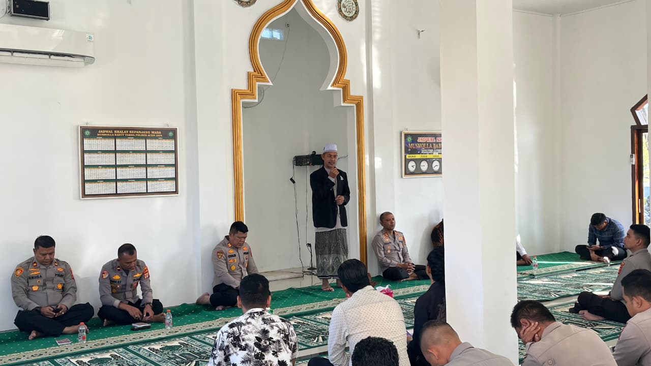 Rangkaian kegiatan dipimpin oleh Ustad Ibnu Hajar, S.Pd.I., yang menyampaikan tausiyah tentang pentingnya menjaga keikhlasan dalam bekerja dan berbuat kebaikan. Acara kemudian ditutup dengan doa bersama untuk keselamatan bangsa dan kelancaran tugas Kepolisian.